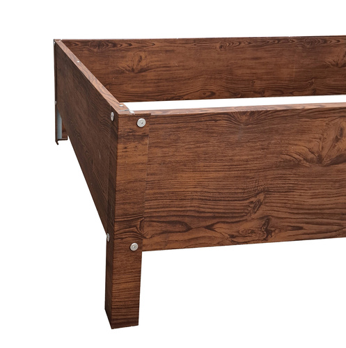 - Podwyższona grządka na warzywa o wymiarach 150 × 75 cm, wysokość bez nóżek 26 cm, wysokość z nóżkami 40 cm. Kolor: imitacja drewna.